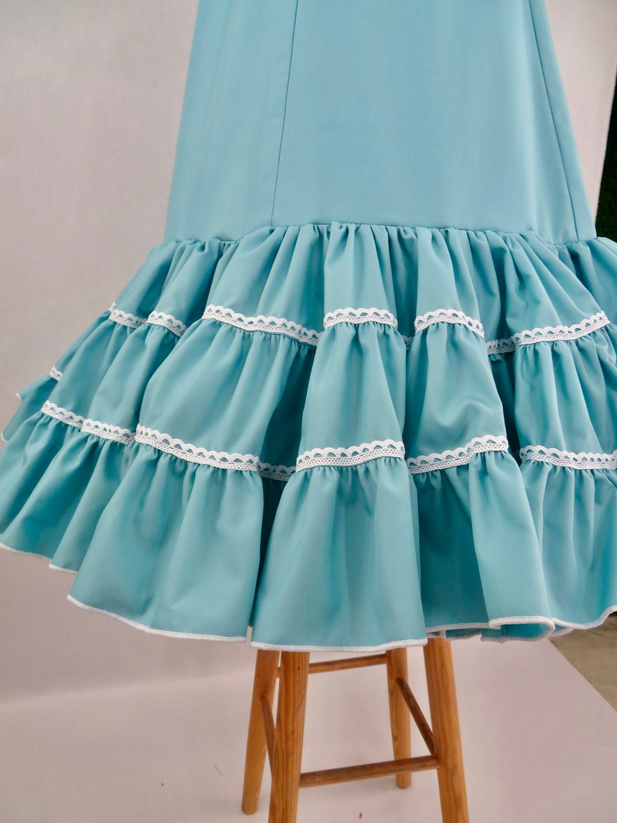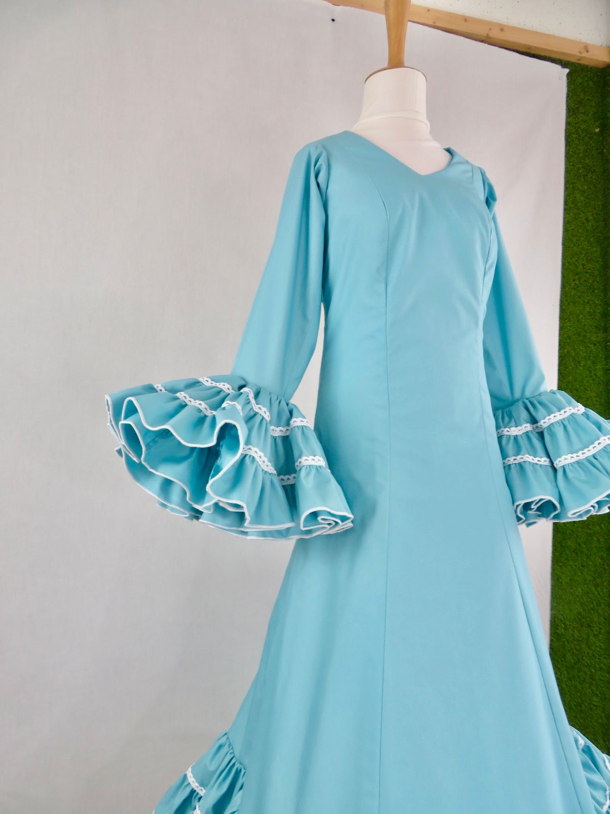 Confeccionado en color celeste liso con detalles en blanco, dando lugar a un diseño elegante, luminoso y de inspiración flamenca tradicional. Ideal para ferias, romerías y ocasiones especiales donde destacar con un estilo auténtico.