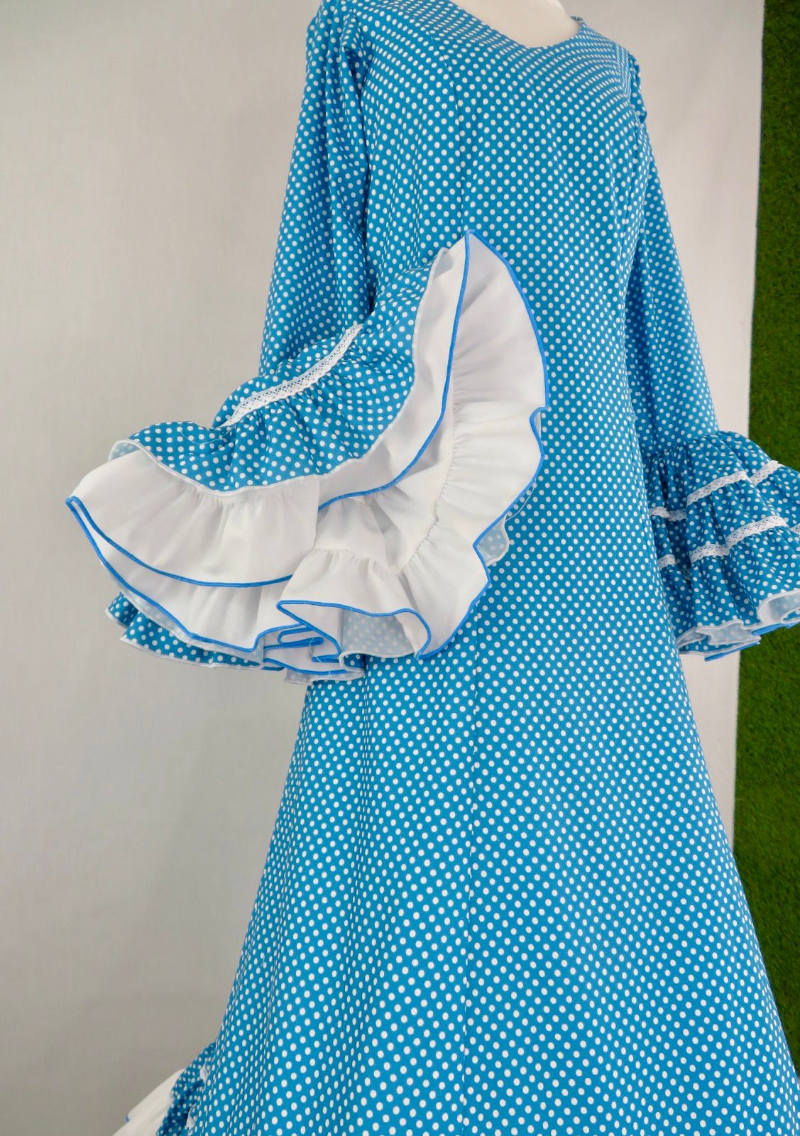 Mangas largas rematadas con grandes volantes fruncidos combinados en dos tejidos, creando contraste y aportando un toque flamenco muy especial.