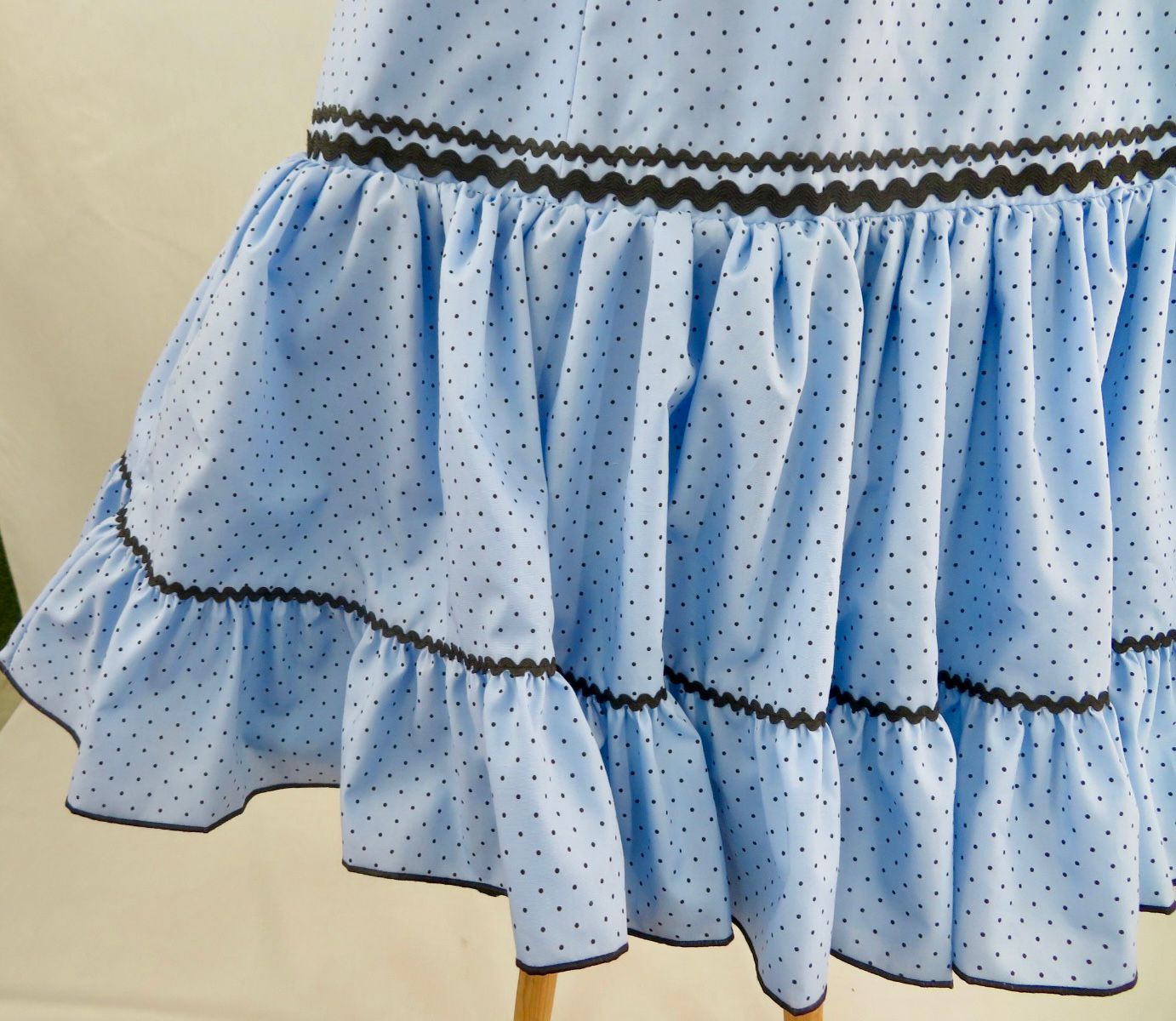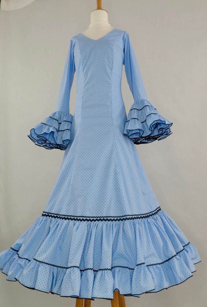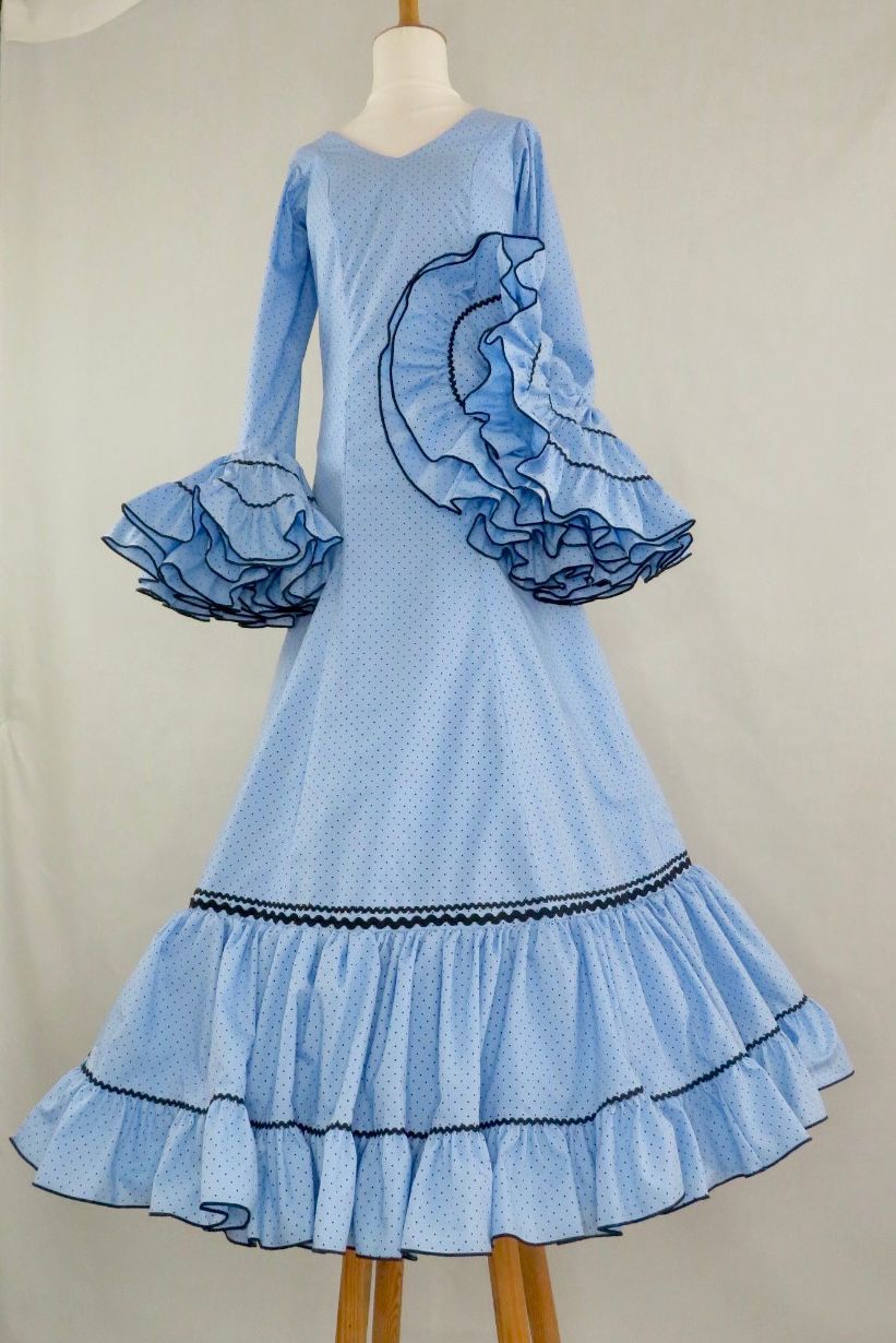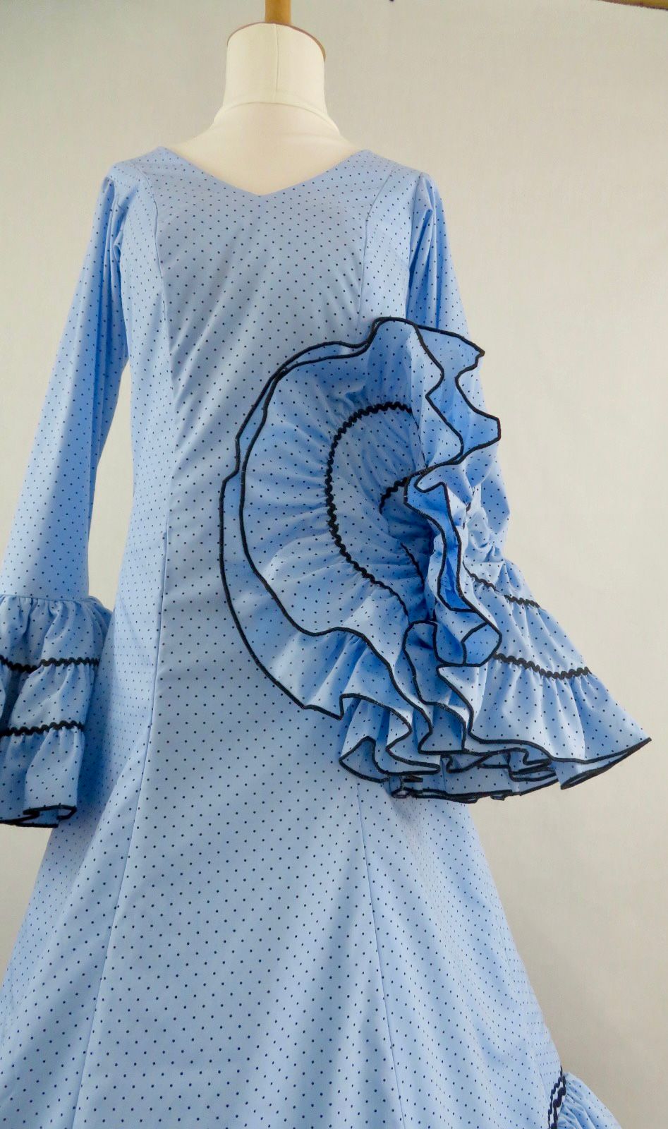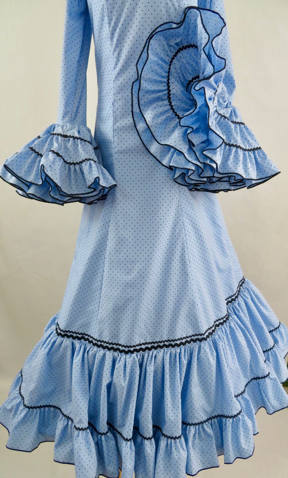 Mangas largas con volantes fruncidos en varias tiras, rematados en contraste oscuro, aportando volumen, estructura y un acabado flamenco muy definido.