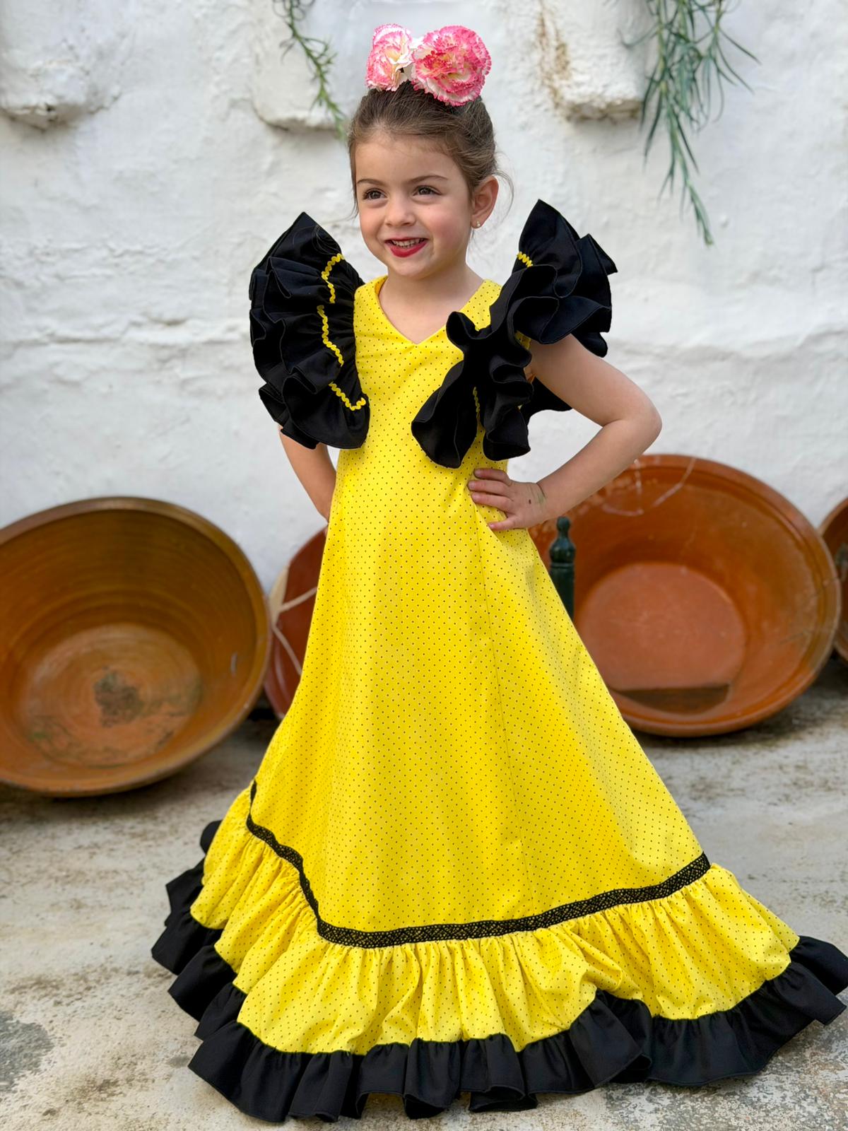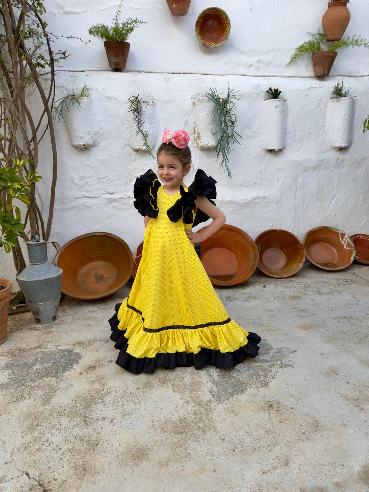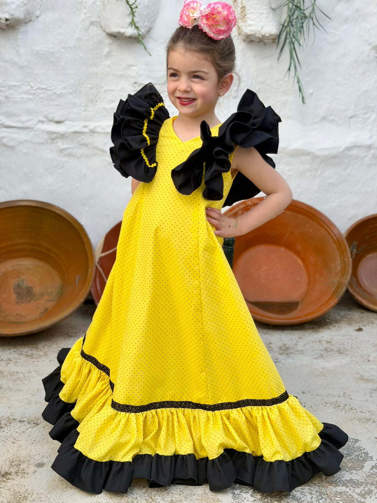 Confeccionado en color amarillo con lunar negro y detalles en negro, creando un conjunto elegante y muy llamativo. Ideal para ocasiones especiales y eventos.