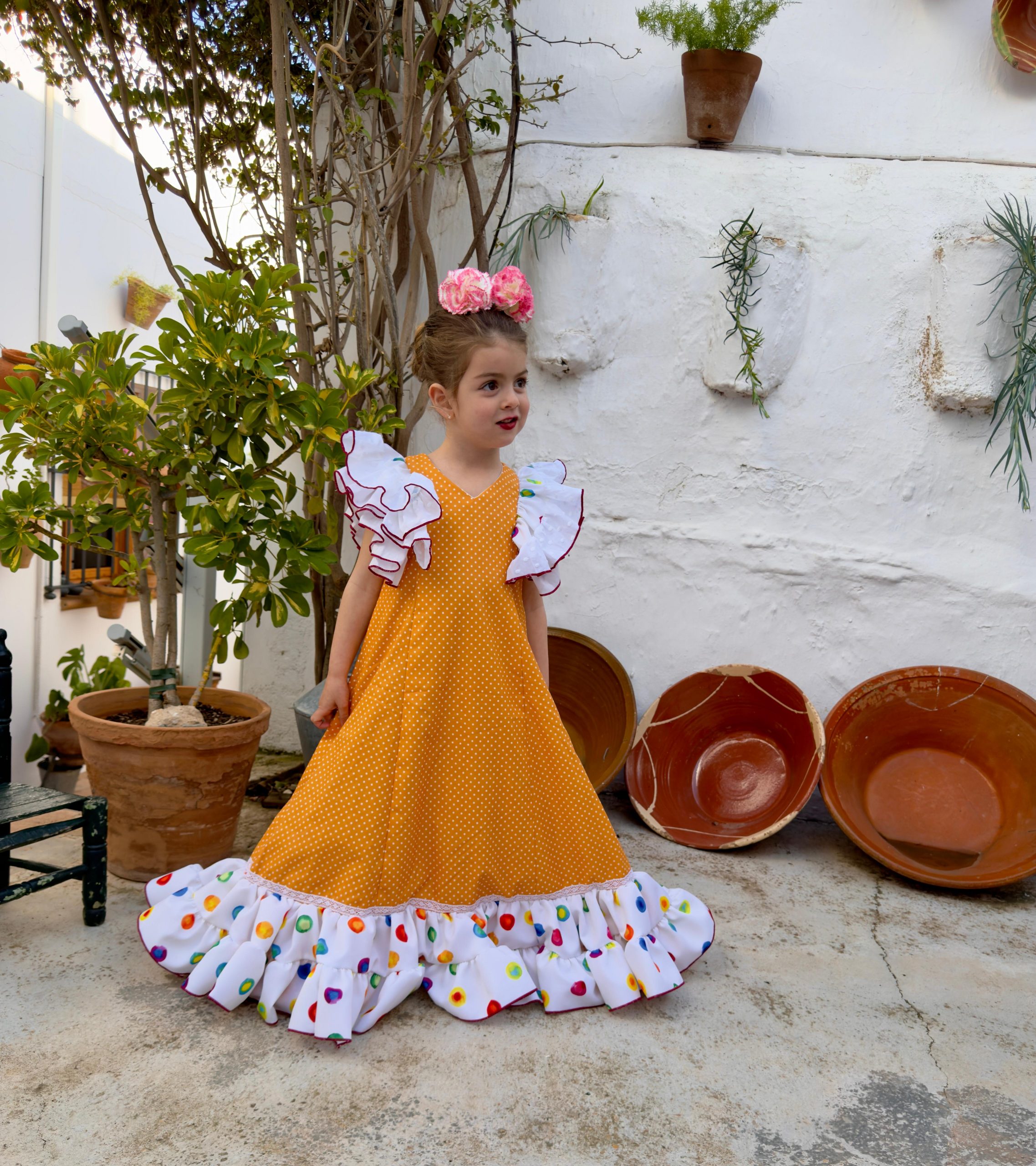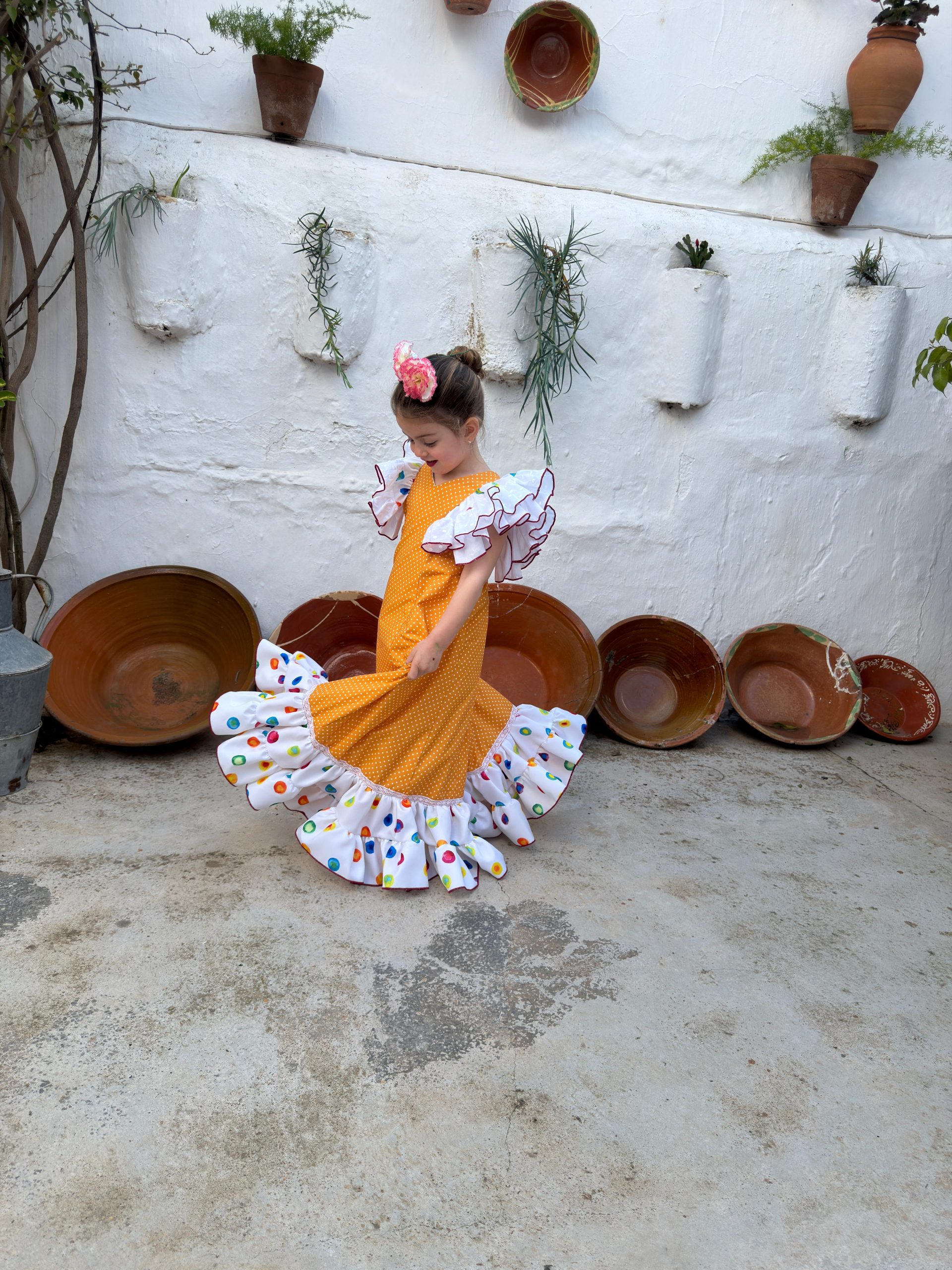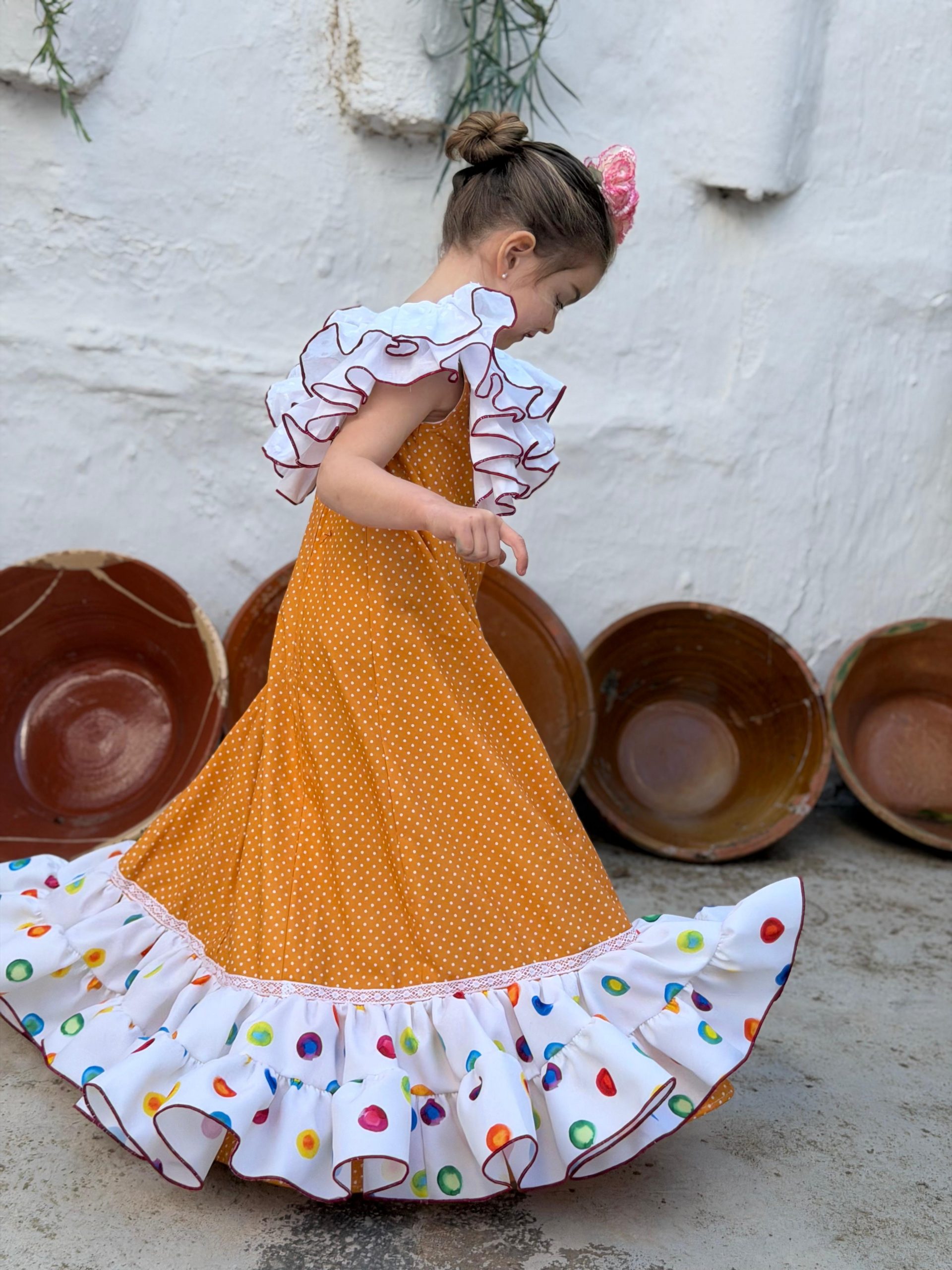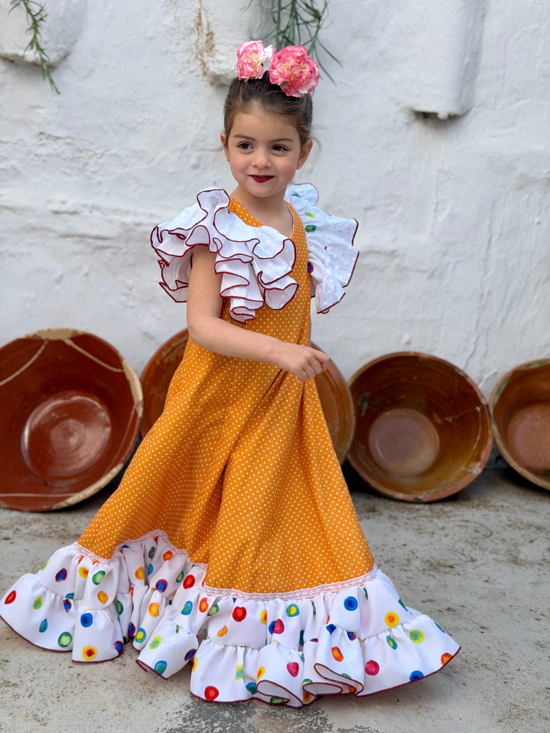Confeccionado en color naranja con lunar blanco y volante inferior en tejido blanco con estampado multicolor, creando un conjunto alegre, original y muy llamativo. Ideal para ocasiones especiales y para que las más pequeñas luzcan cómodas sin renunciar al estilo.