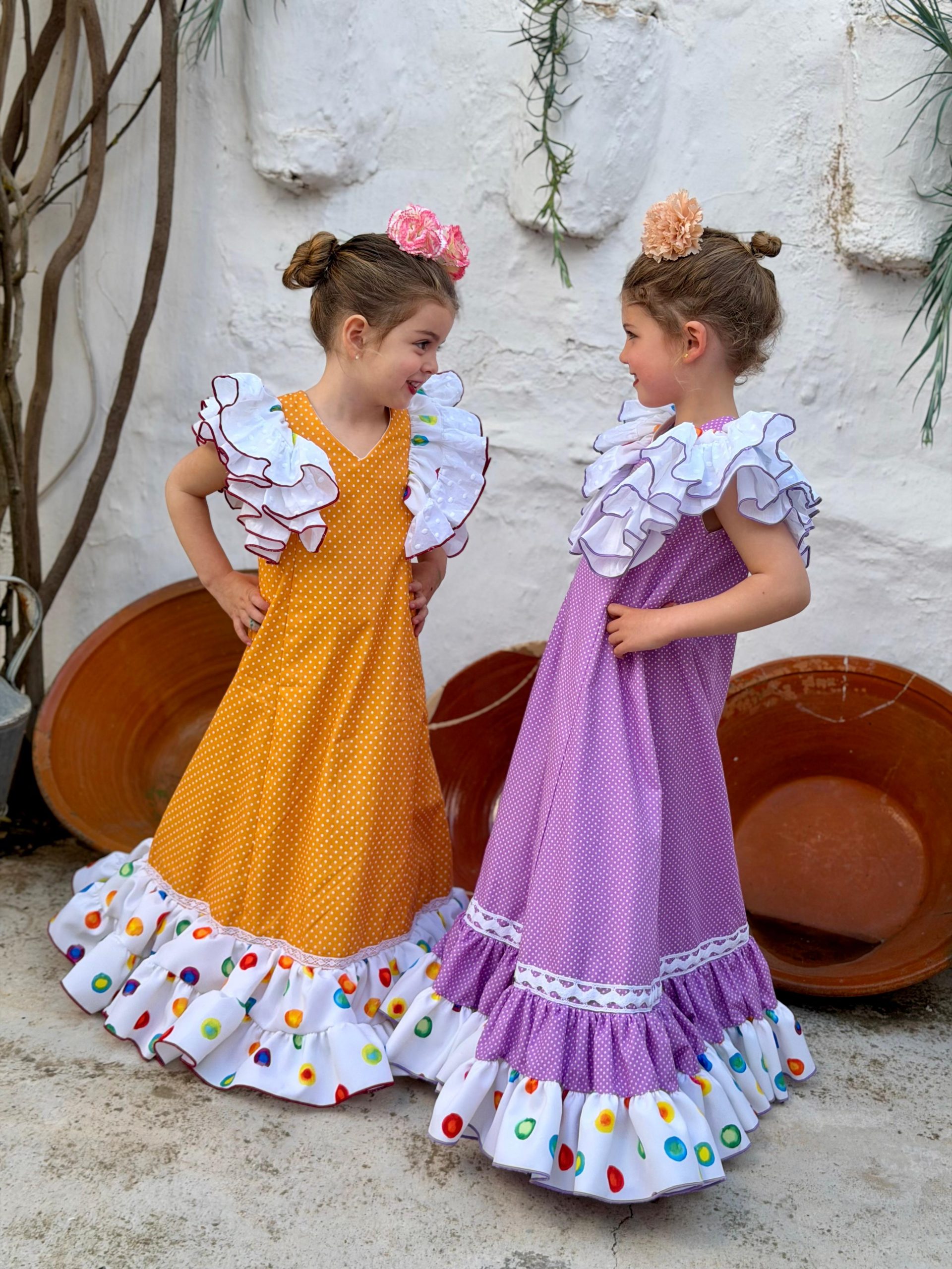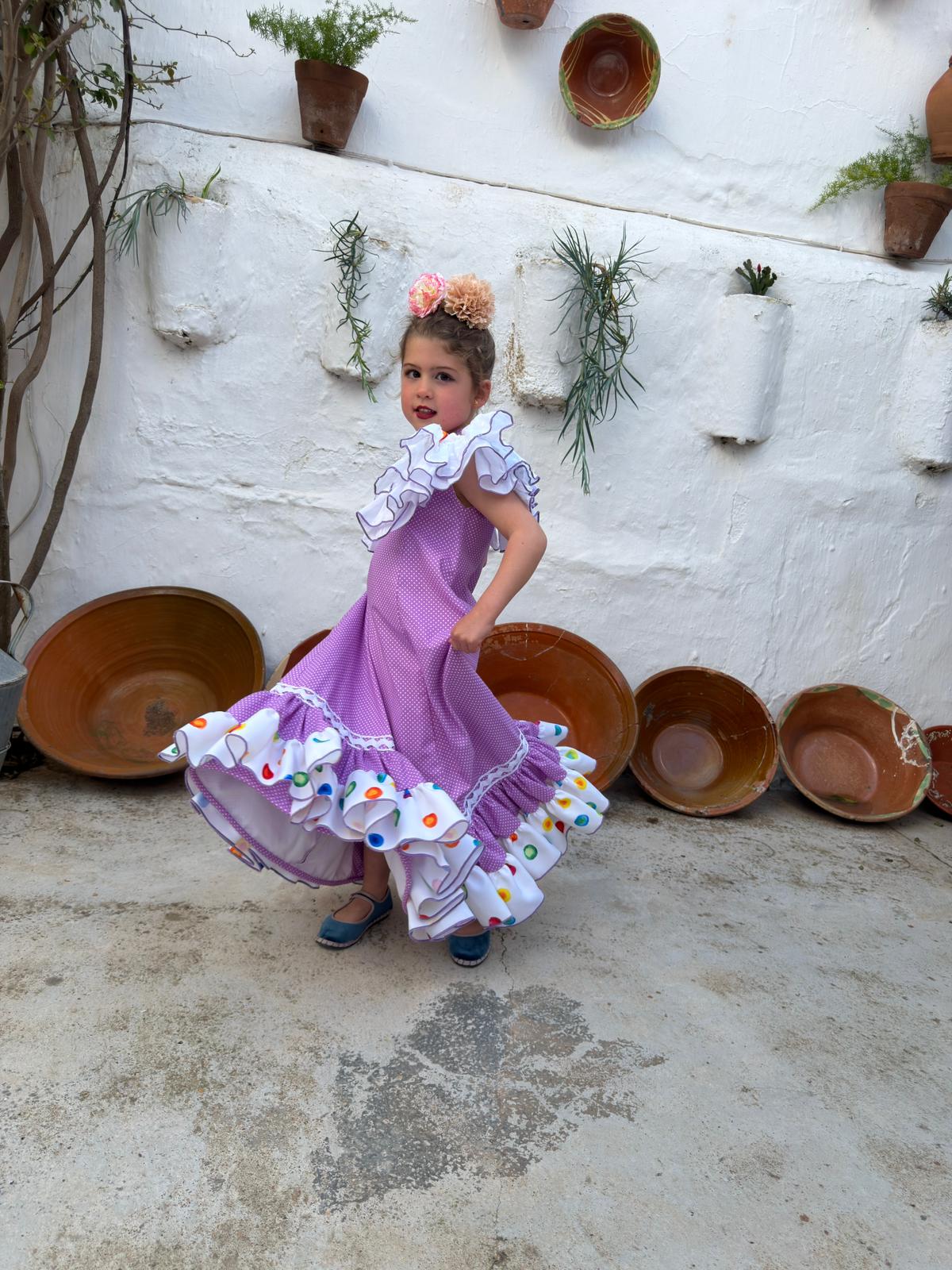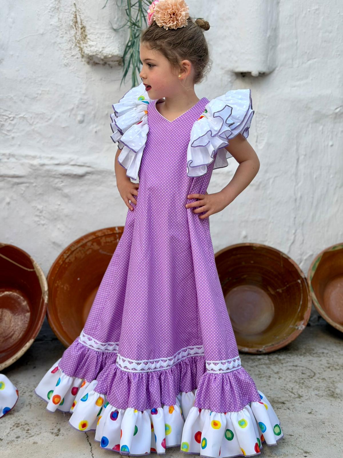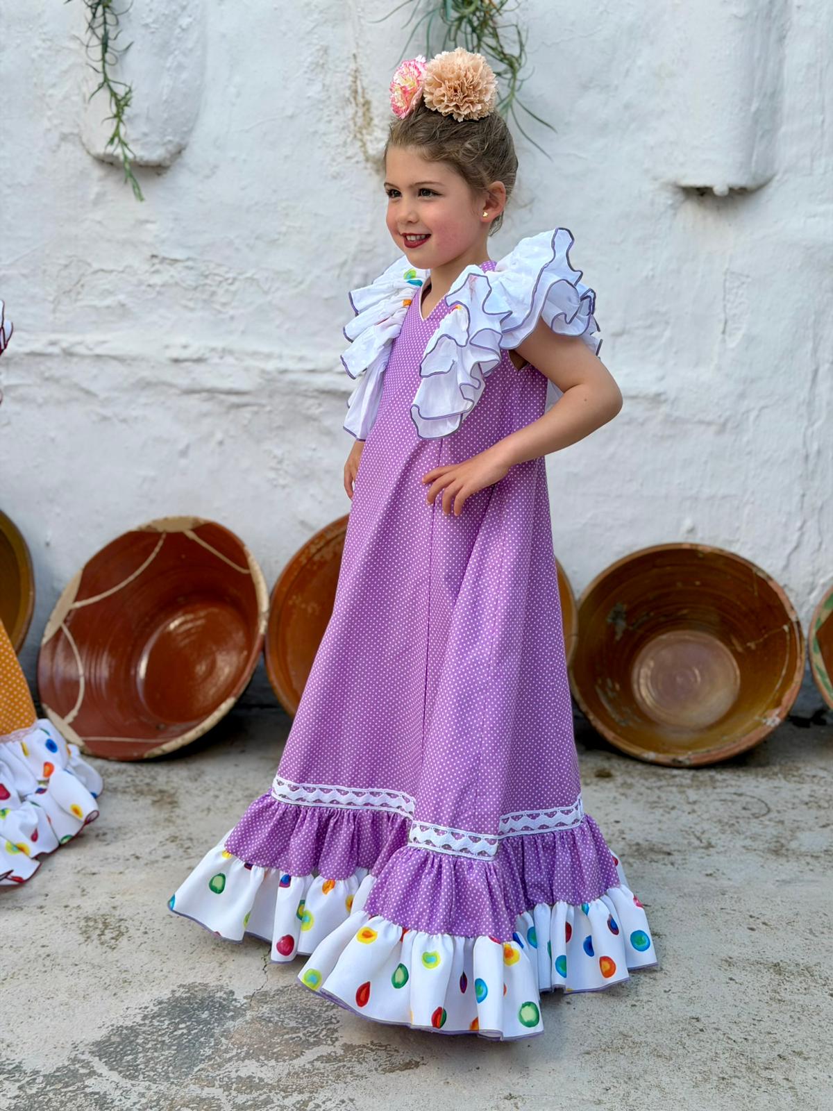 Confeccionado en color lila con lunar blanco y volante inferior en tejido blanco con estampado multicolor, creando un conjunto alegre, dulce y muy vistoso. Ideal para ocasiones especiales y para que las más pequeñas disfruten con total comodidad.