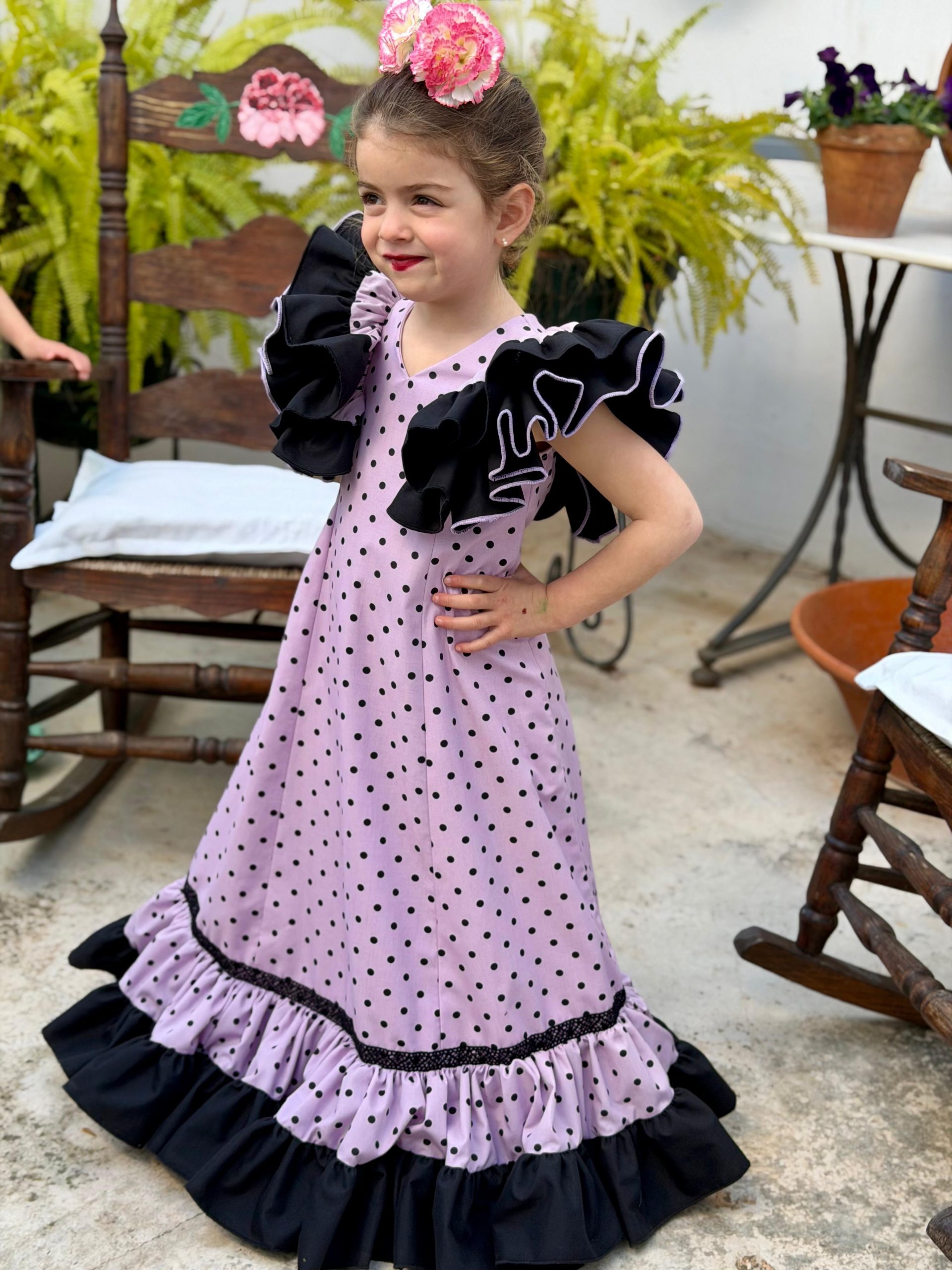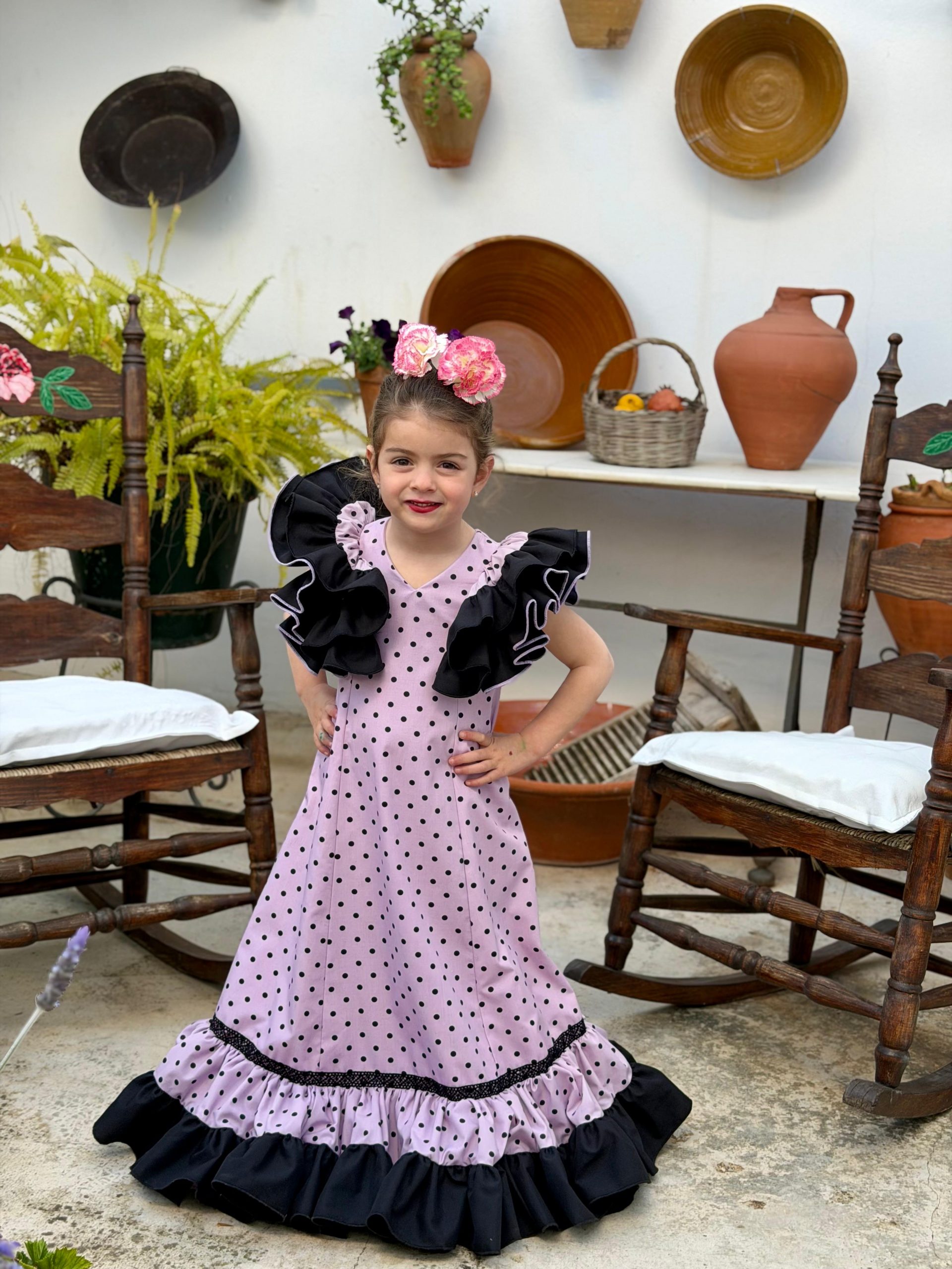 Confeccionado en color rosa empolvado con lunar negro y volante inferior en contraste negro, dando como resultado un diseño elegante, moderno y muy favorecedor. Ideal para ocasiones especiales y para que las más pequeñas luzcan cómodas sin renunciar al estilo.