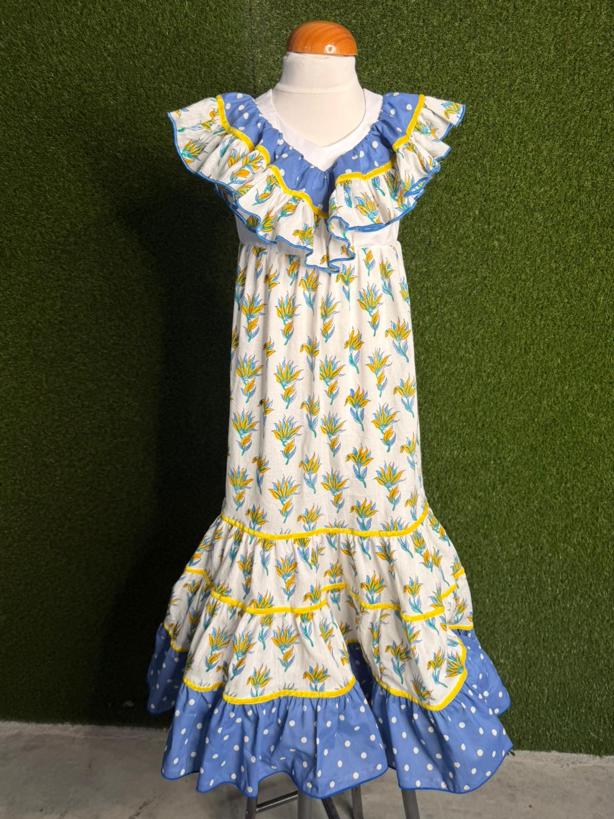 Traje de Flamenca cortado por encima de cintura con falda canastera de cuatro volantes. Con volantes canasteros de dos cortes colocado en el escote a modo de mangas.